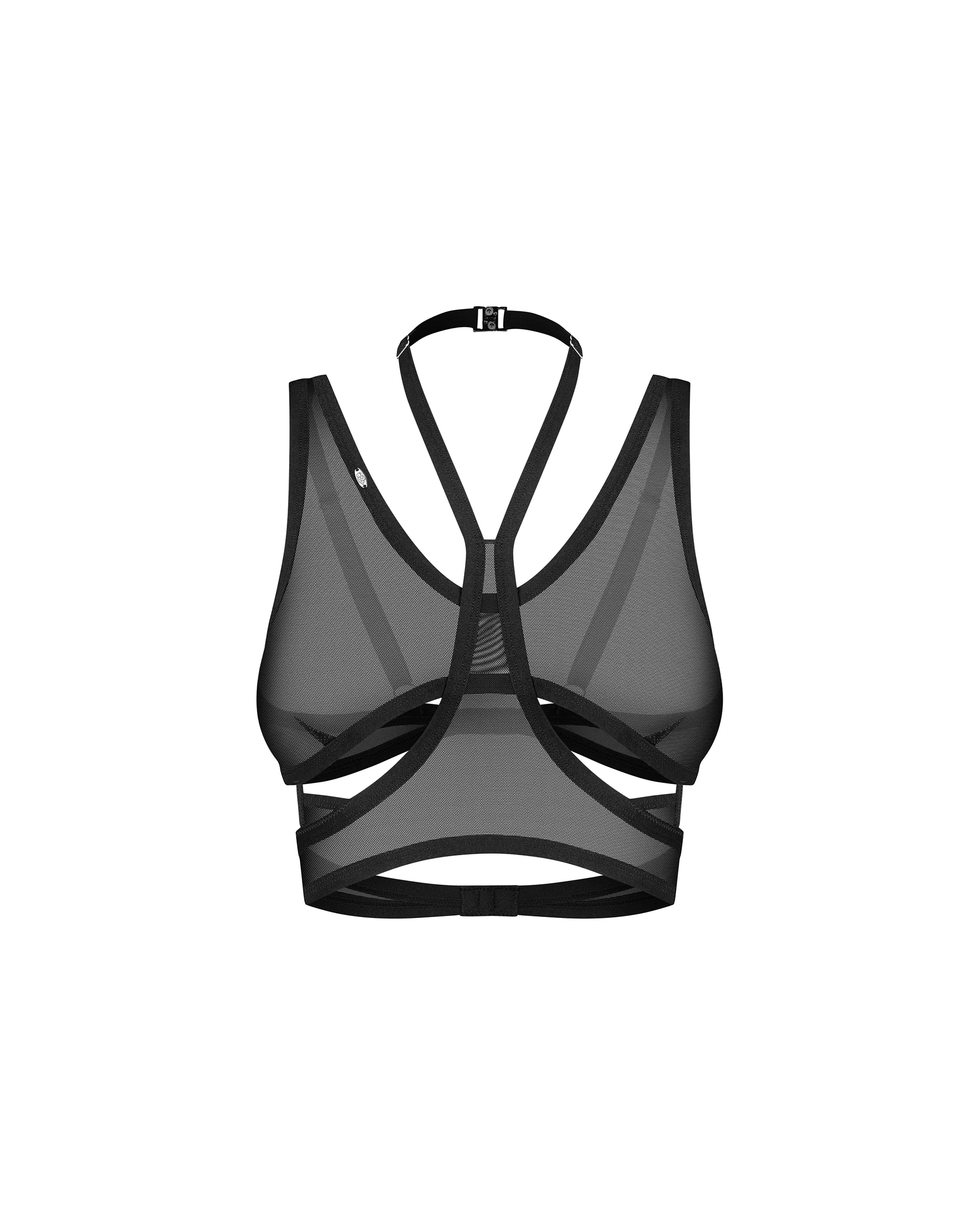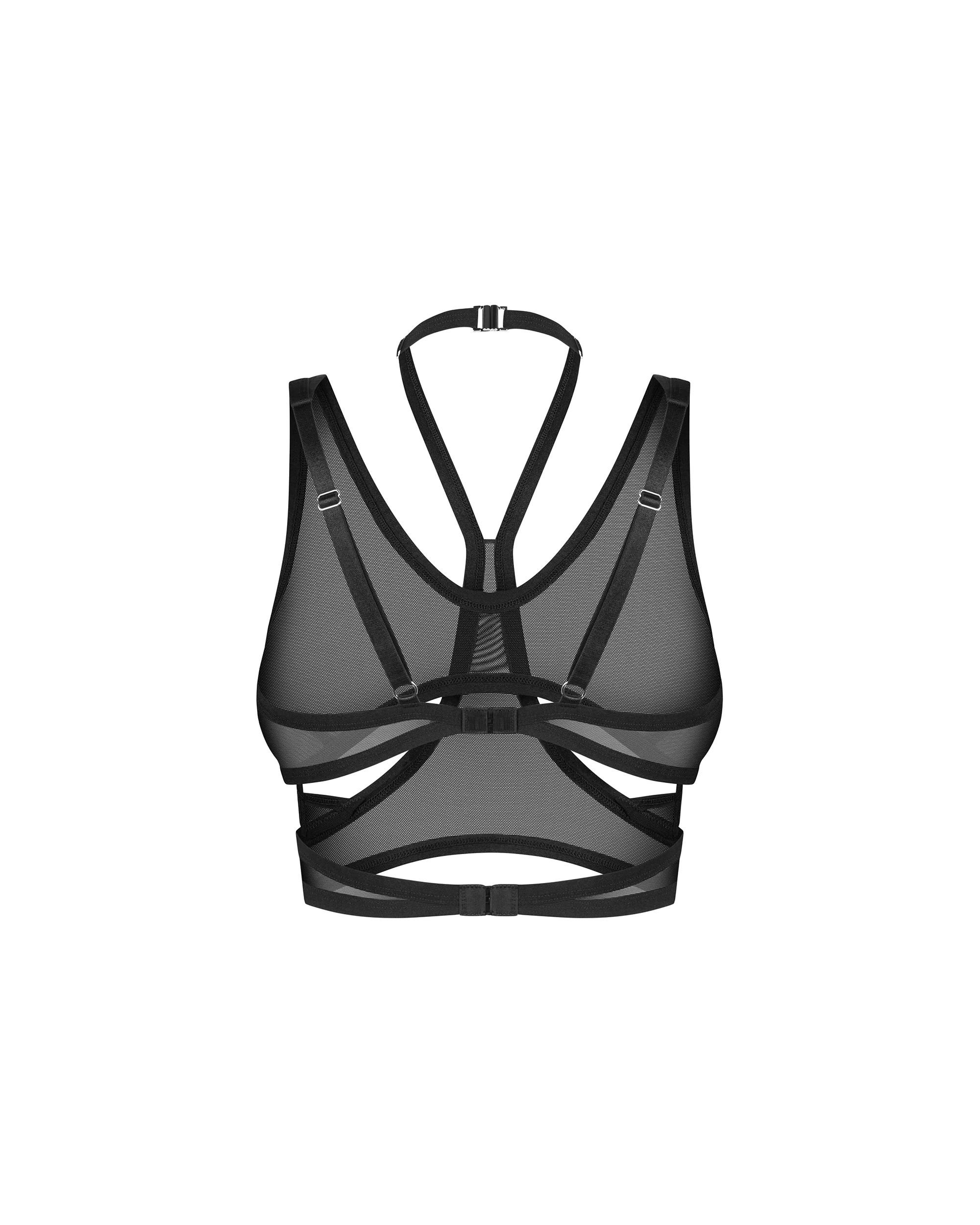 The Mercuris Black Top redefines modern allure with its sheer mesh fabric and razor-sharp geometric detailing. Adjustable three-step closures at the bust and waist contour your silhouette, while the neck and shoulder straps offer customizable comfort. Designed for women who craft their style from the smallest detail, this piece transitions effortlessly from layered elegance to standalone seduction.