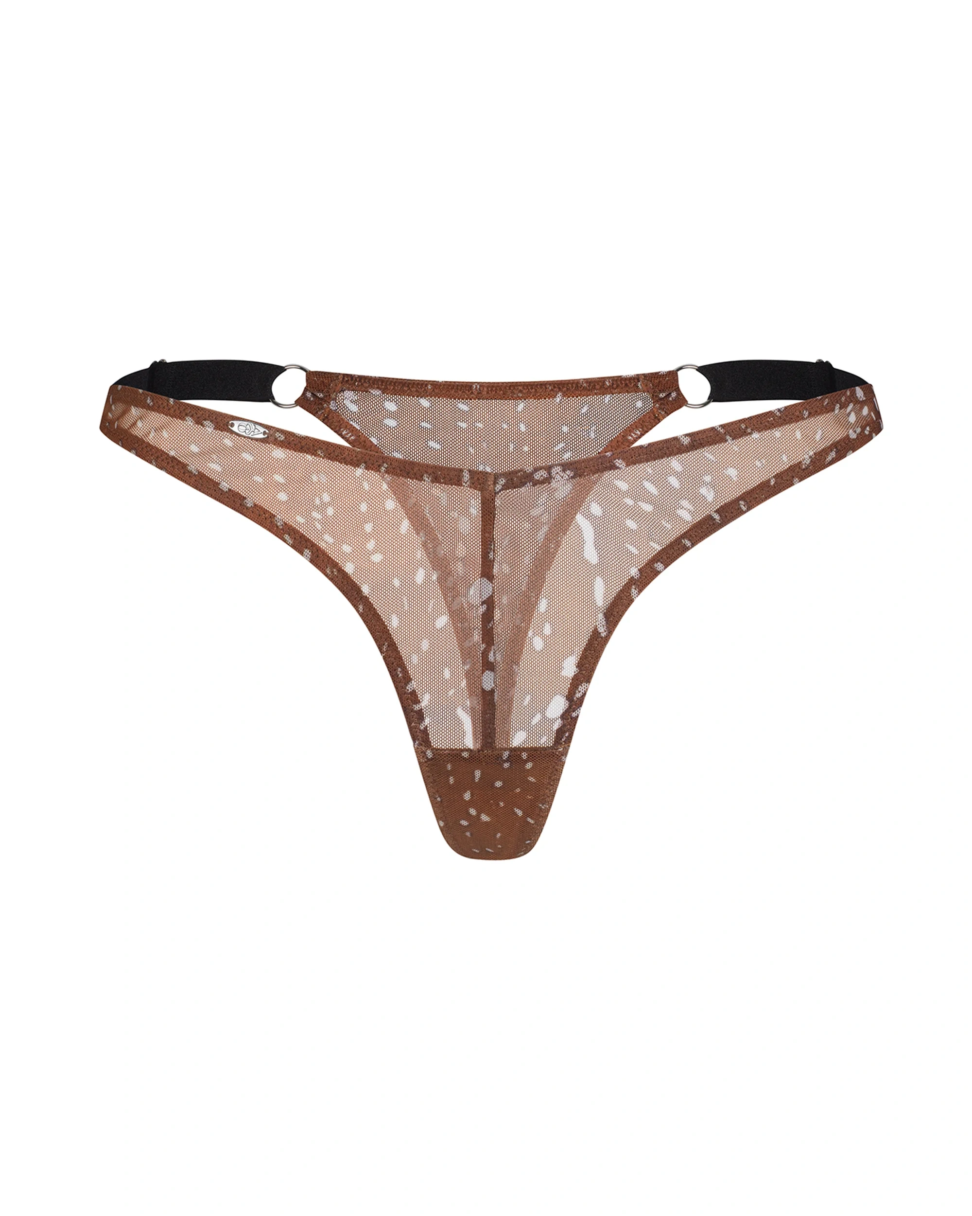 Thong made of transparent mesh with a unique, nature-inspired spotted pattern. The brown shade of the fabric combined with black straps creates a modern, contrasting effect. Thin, adjustable side straps finished with metal accents add a slightly daring touch. This design combines comfort and style – perfect both together with the Vixaria bra or on its own.